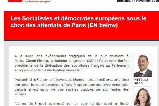 A la suite des événements tragiques de la nuit dernière à Paris, Gianni Pittella, président du groupe S&D et Pervenche Berès, présidente de la délégation des socialistes français au Parlement européen ont fait…