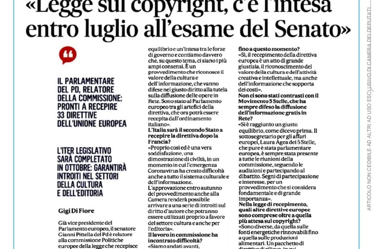 La mia intervista odierna a “Il mattino” sulla direttiva copyright, presto all’esame del Senato